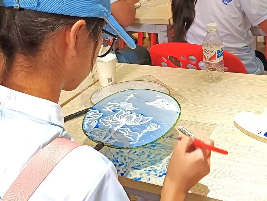 最令人期待的環(huán)節(jié)當(dāng)屬親手繪制扇面。同學(xué)們以改良蠟染畫(huà)的方式,在扇子上盡情揮灑自己的創(chuàng)意,結(jié)合蠟染文化將心中的青花瓷完美呈現(xiàn)。眼中的青花瓷,手里的扇面,一筆一劃,是同學(xué)們與青花瓷的靈魂共鳴,更是對(duì)傳統(tǒng)文化的熱愛(ài)與傳承。