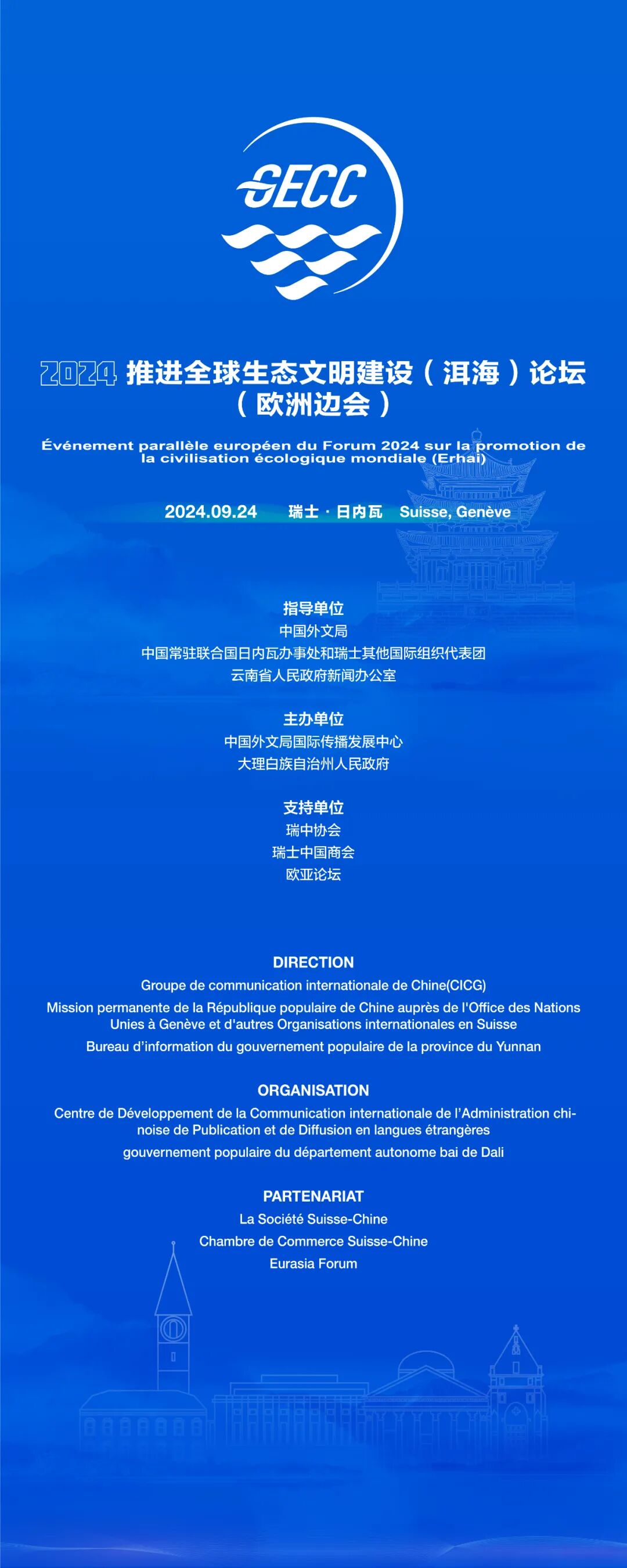 自2021年創(chuàng)立以來,推進(jìn)全球生態(tài)文明建設(shè)(洱海)論壇已連續(xù)成功舉辦三屆。為進(jìn)一步推動(dòng)中歐在生態(tài)系統(tǒng)治理上的經(jīng)驗(yàn)共享與交流,開展務(wù)實(shí)交往合作,擴(kuò)大洱海論壇國際影響力,2024年9月24日,2024 推進(jìn)全球生態(tài)文明建設(shè)(洱海)論壇(歐洲邊會(huì))系列活動(dòng)將在瑞士日內(nèi)瓦舉辦。