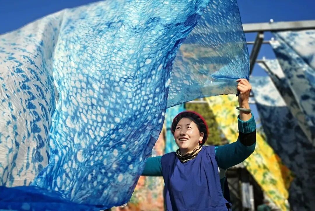 白族扎染技藝是第一批國家級(jí)非物質(zhì)文化遺產(chǎn)代表性項(xiàng)目,是我國歷史悠久的紡織染色工藝之一,具有較高的歷史文化價(jià)值和藝術(shù)價(jià)值,尤以喜洲鎮(zhèn)周城村的白族扎染最為著名。傳統(tǒng)白族扎染主要采用蓼藍(lán)、板藍(lán)根、艾蒿等天然植物的藍(lán)靛溶液進(jìn)行染色。