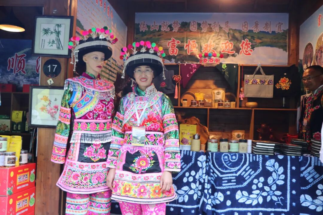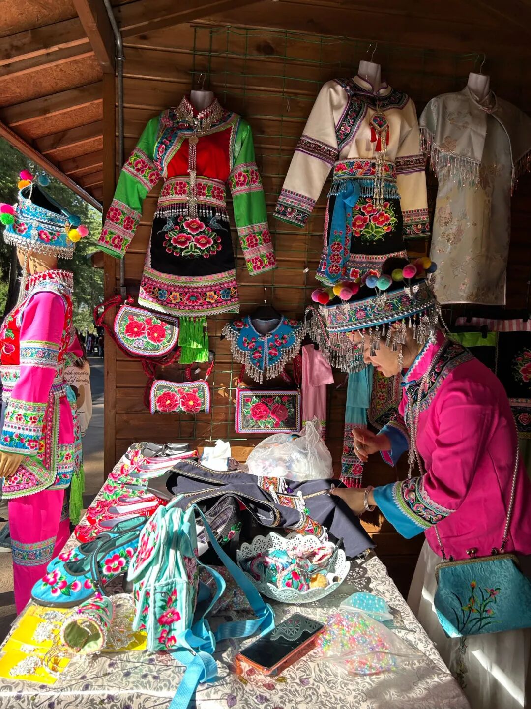 彝繡非遺傳承人在日月湖平臺(tái)區(qū)域帶領(lǐng)身著彝族刺繡盛裝的阿表妹進(jìn)行彝族繡服裝展示及游客互動(dòng)。