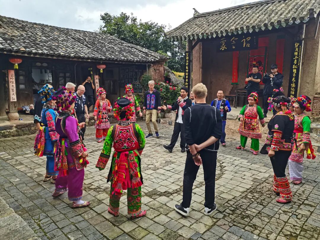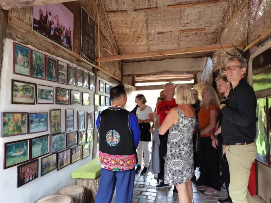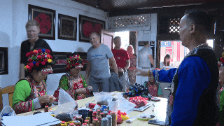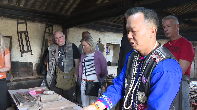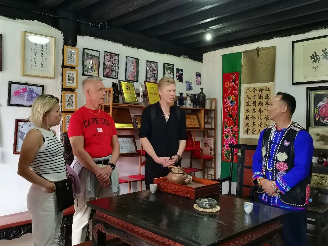 上午十一點(diǎn),來自瑞典的旅行團(tuán)在瞿標(biāo)祥帶領(lǐng)下,沿著村里的茶馬古道徒步走進(jìn)古樸的吊草村,來到傳習(xí)所參觀體驗(yàn)彝族非遺文化。瞿標(biāo)祥用流利的英語為外國朋友們介紹彝族的建筑、服飾、禮儀和婚喪嫁娶的習(xí)俗。