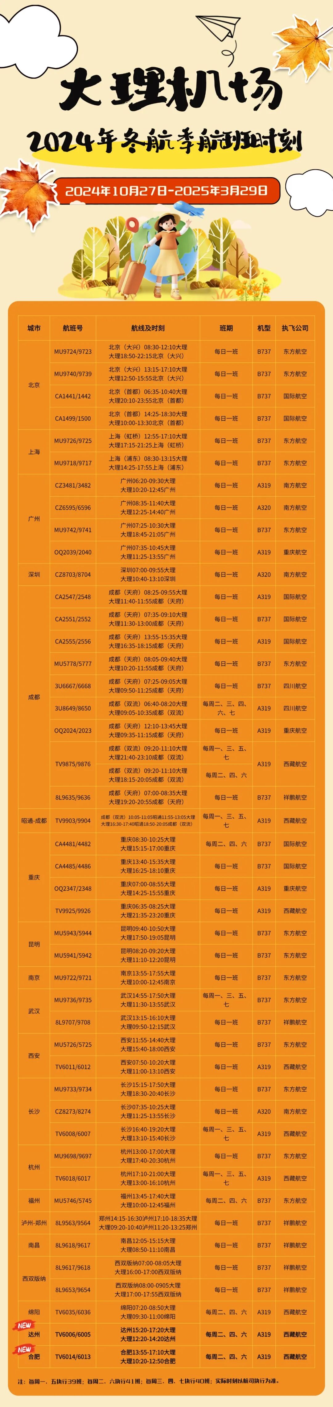 10月27日起,全國民航開始執(zhí)行2024年冬春航季航班計劃。大理機(jī)場將于27日新開達(dá)州、合肥航線,通達(dá)國內(nèi)航點(diǎn)24個,冬春航季時刻總量658個/周,國內(nèi)機(jī)場排名第62位,已基本通達(dá)國內(nèi)重要城市和省內(nèi)主要旅游城市,同比2023年冬春航季總時刻量增長23.7%,增量前三位為東航、祥鵬、藏航,分別同比增長17%、33%、24%。其中航司份額前三為東航29%、祥鵬17%、國航15%。同時還加密了廣州、長沙、版納、鄭州等航線,通達(dá)21個城市,實(shí)現(xiàn)航點(diǎn)覆蓋全國14個省區(qū)市。換季后,還有望引進(jìn)新承運(yùn)人,承運(yùn)航空公司將達(dá)10家。