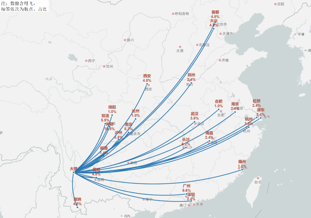 從航班計劃來看,大理機(jī)場至西南區(qū)域航班占總量的35%以上,超6家航空公司運(yùn)營,已形成較穩(wěn)定的客源地市場。其余北京、上海、廣州、深圳核心一線城市航線同比2023年冬春航季也進(jìn)行了加密。