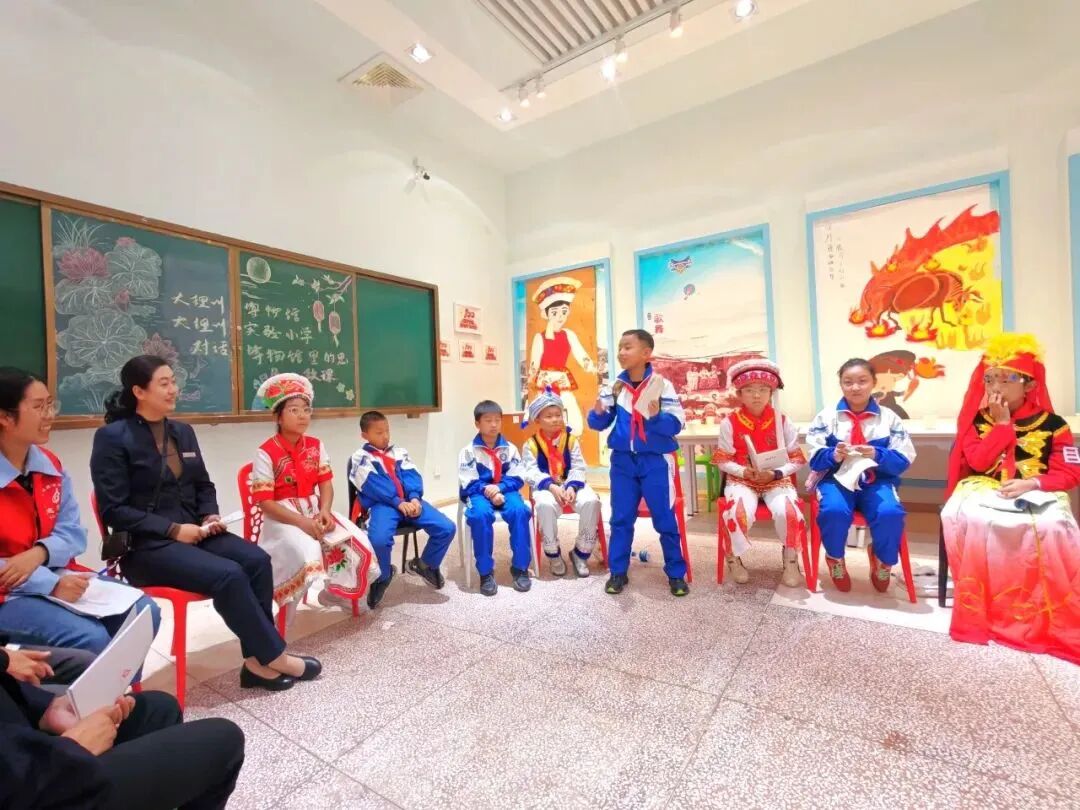 為更好的發(fā)揮博物館的教育職能,在大理州博物館副研究館員華春湧、宣教部副主任何七美、洱源牛街文化站站長李銀芬以及宣教部講解員的帶領(lǐng)下,實(shí)驗(yàn)小學(xué)五年級的優(yōu)秀代表在社教活動室開展了一場輕松愉快的“對話博物館里的思政課”活動。一場穿越時空的博物館對話就此展開,一方面專家耐心解答了同學(xué)們在參觀途中的疑問,另一方面工作人員詢問了同學(xué)們參觀后的感受和對博物館教育的建議。