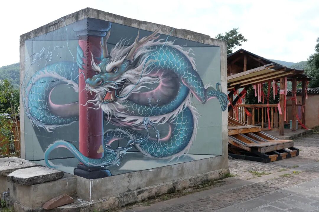 “90后”墻繪師劉小備今年夏天來(lái)到七宣村,根據(jù)場(chǎng)景構(gòu)圖,結(jié)合七宣村龍的文化,加上創(chuàng)新元素,繪制了一幅3D龍的墻繪。另一幅則是在一面村民涂鴉過(guò)的墻面上,再現(xiàn)了一位穿著彝族服裝的小女孩給墻壁涂鴉的畫(huà)面。
