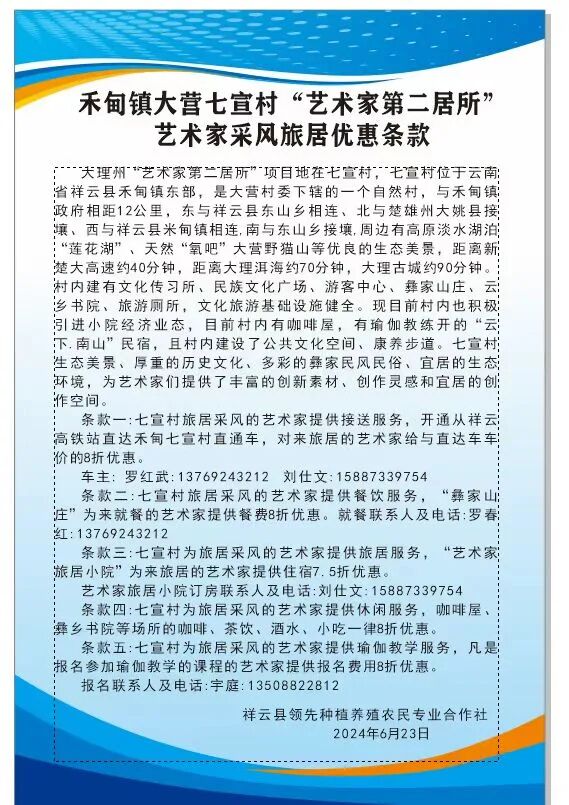 為鼓勵(lì)更多藝術(shù)家、創(chuàng)業(yè)者來(lái)到七宣村,當(dāng)?shù)卣雠_(tái)了對(duì)村內(nèi)開(kāi)展業(yè)態(tài)經(jīng)營(yíng)時(shí)間半年及以上的“新村民”進(jìn)行第一年租金減免的相關(guān)政策。2024年6月,祥云縣領(lǐng)先種植養(yǎng)殖農(nóng)民專(zhuān)業(yè)合作社發(fā)布了《禾甸鎮(zhèn)大營(yíng)七宣村“藝術(shù)家第二居所”藝術(shù)家采風(fēng)旅居優(yōu)惠條款》,其中對(duì)常駐七宣村的藝術(shù)家及手藝人的交通、餐飲、住宿等優(yōu)惠政策做了詳細(xì)說(shuō)明。