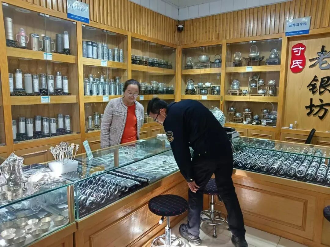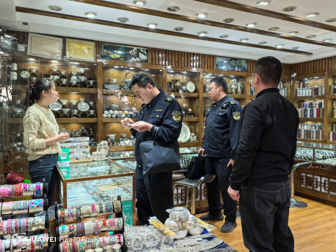 11月24日,記者來(lái)到雙廊古鎮(zhèn),看到涉事的兩家銀器店已停止?fàn)I業(yè),店鋪門(mén)頭已拆除。市場(chǎng)監(jiān)管執(zhí)法人員正對(duì)鎮(zhèn)內(nèi)各類(lèi)經(jīng)營(yíng)主體的營(yíng)業(yè)執(zhí)照、產(chǎn)品的生產(chǎn)許可、價(jià)格標(biāo)識(shí)等內(nèi)容進(jìn)行檢查。