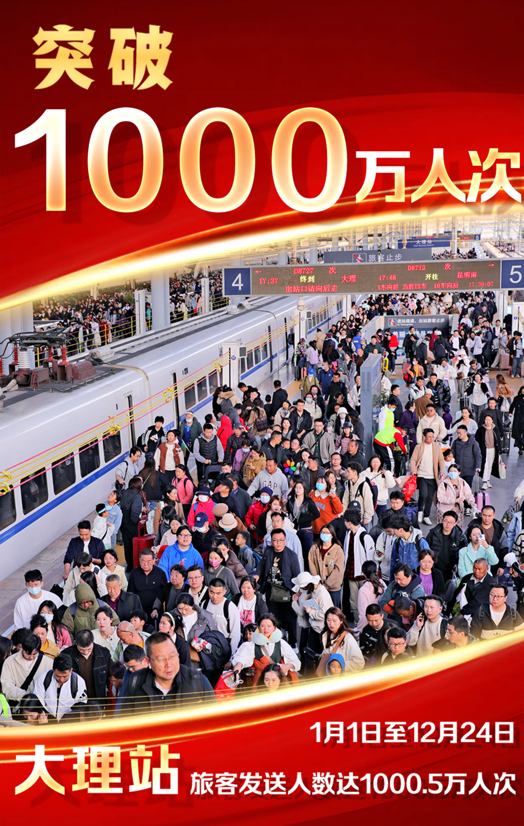 653萬人次、392萬人次、473.8萬人次、418萬人次、929.4萬人次……這是過去五年大理火車站完成的旅客發(fā)送人數。12月24日,大理站旅客發(fā)送迎來巔峰時刻。截至當天18點,車站今年已發(fā)送旅客1000.5萬人次,年旅客發(fā)送量首次突破千萬人次大關。