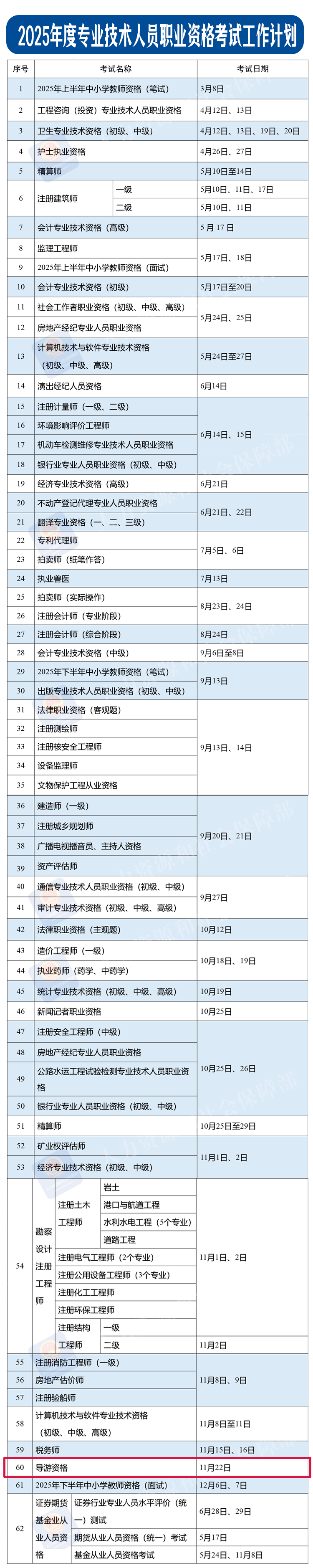 近日,人力資源和社會保障部辦公廳印發(fā)《關(guān)于2025年度專業(yè)技術(shù)人員職業(yè)資格考試工作計劃及有關(guān)事項的通知》。大家關(guān)心的考試時間表定了!2025年導(dǎo)游資格考試定于11月22日,具體如下: