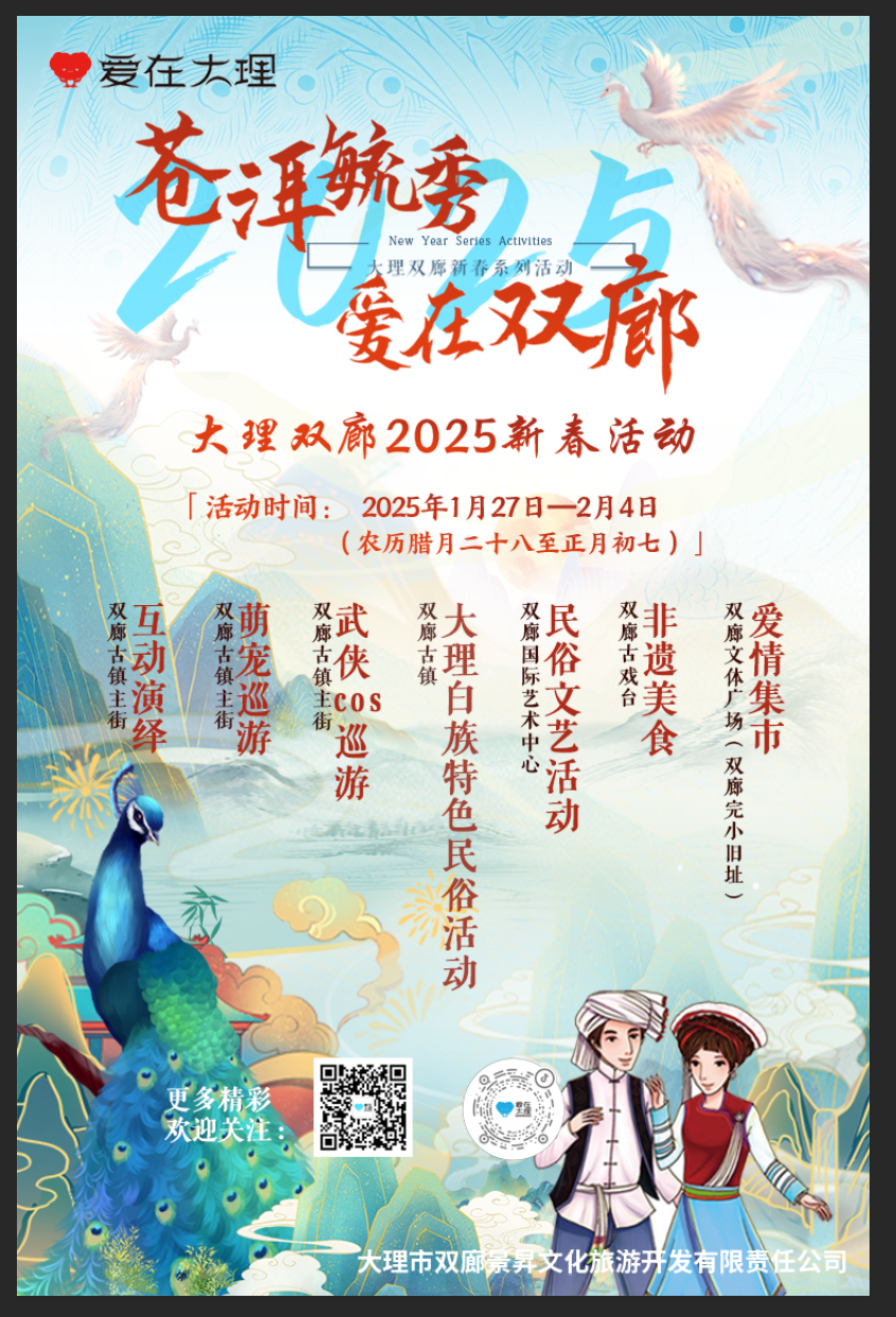 在這個充滿希望與溫暖的蛇年新春,大理雙廊邀您共赴一場關于愛與美好的盛宴!從2025年1月27日至2月4日,一場融合傳統(tǒng)與現(xiàn)代、浪漫與歡笑的“大理雙廊2025新春活動”即將璀璨啟幕,而其中的愛情集市,更是這場盛宴中不可錯過的甜蜜篇章!