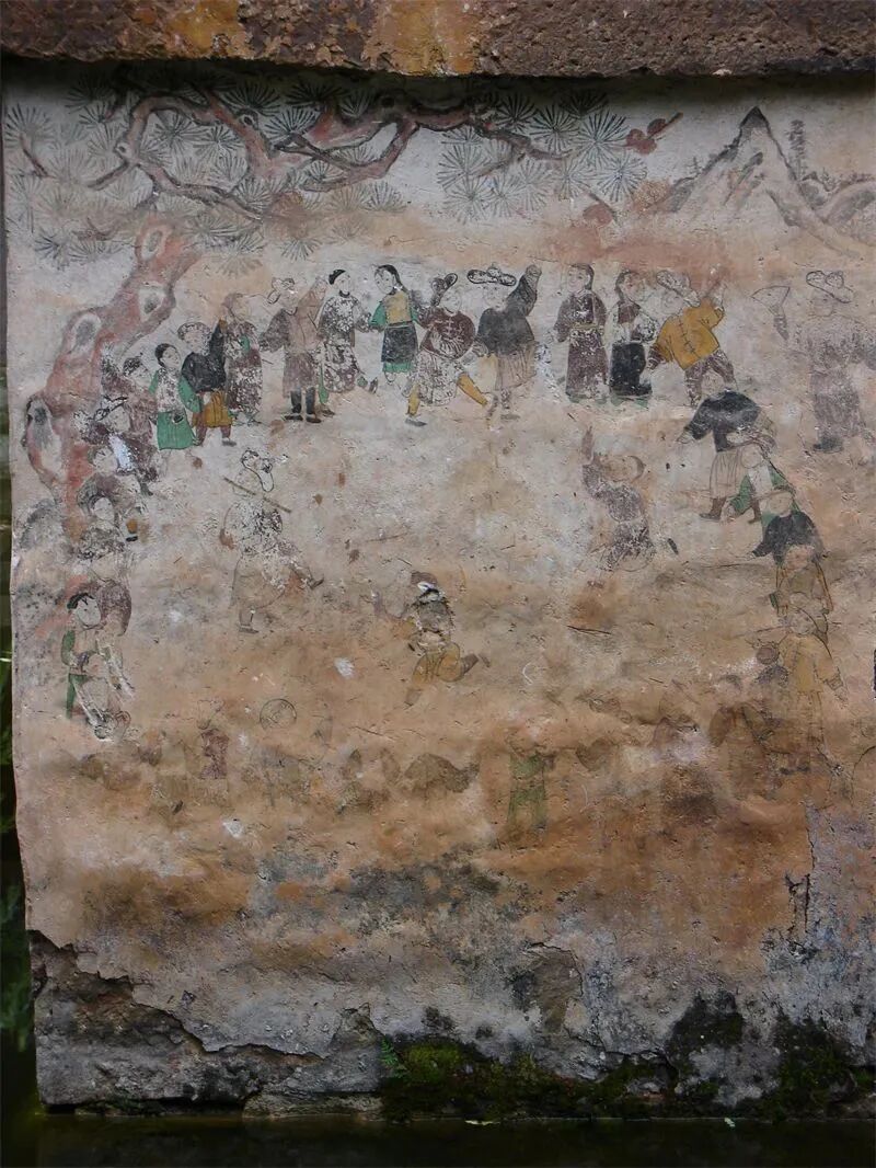 (大理州巍寶山文昌宮壁畫《松下踏歌圖》,呈現(xiàn)出清乾隆年間彝族打歌的生活場景。)