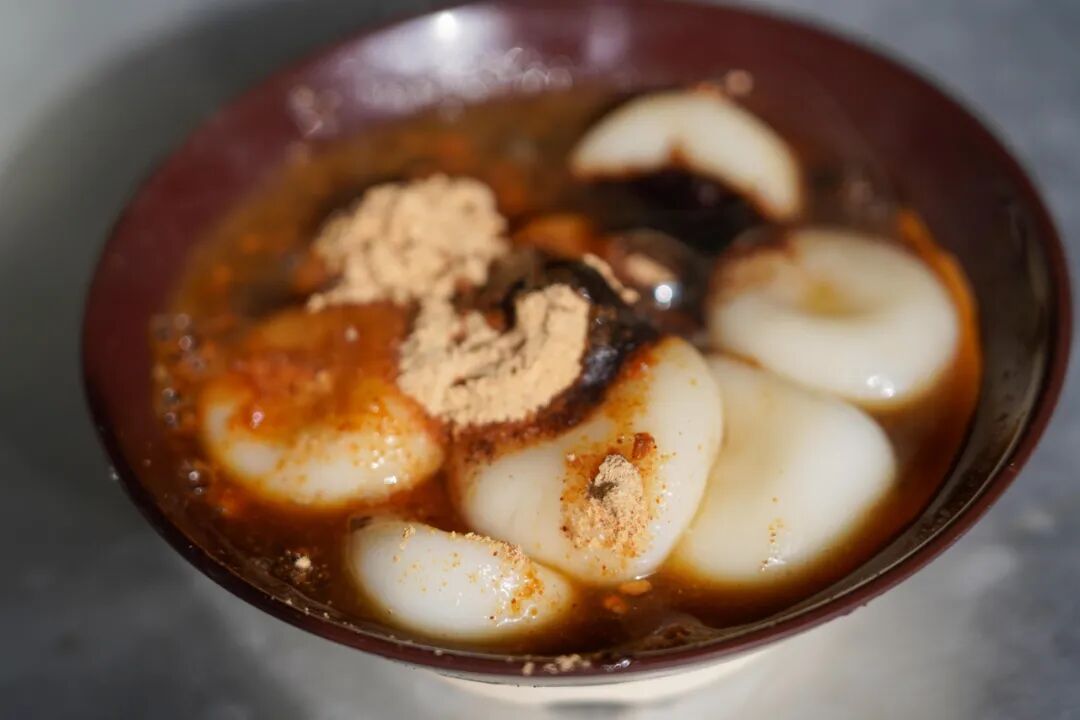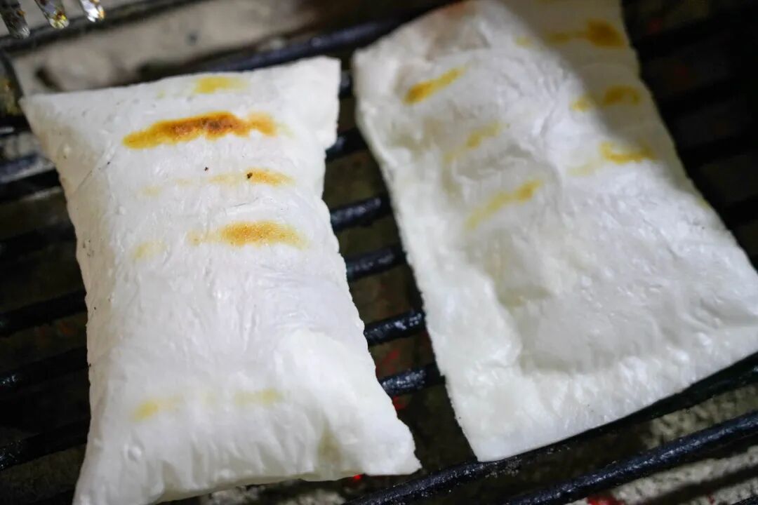 新鮮現(xiàn)做的餌塊,在炭火上烤幾分鐘,就會(huì)鼓起來(lái),頓時(shí)柔軟蓬松,抹上醬料、香氣四溢。