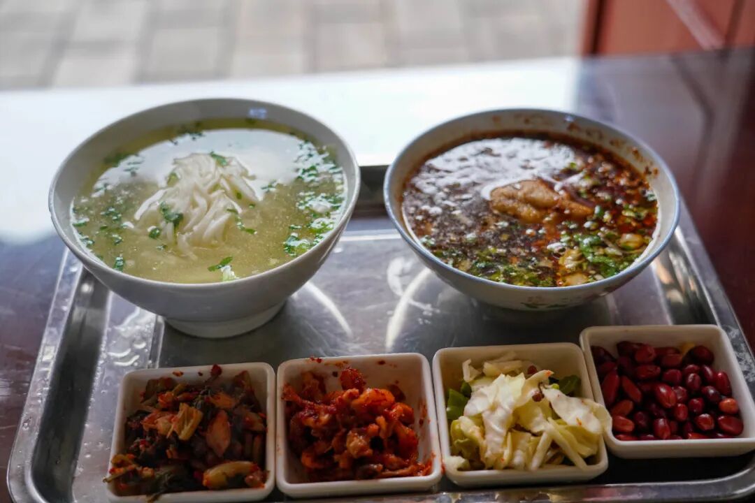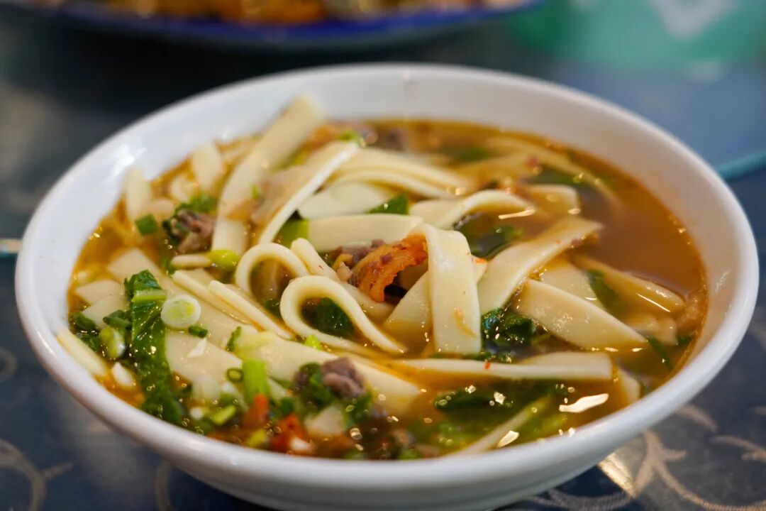 煮好的餌絲,加上爛而不散的??肉,加入蔥花、辣椒等佐料,配上泡菜和腌菜,口感恰到好處。