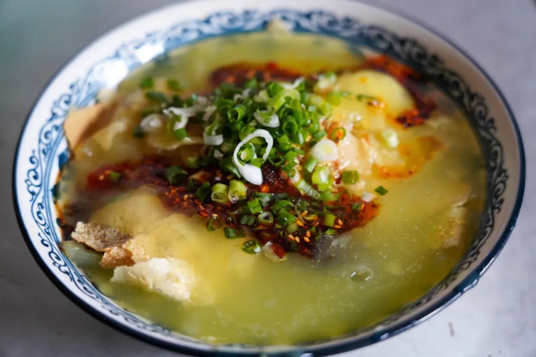 一種用豌豆做出來(lái)的美食,把香脆金黃的豌豆鍋巴,扯碎放入熱油粉中,配上辣椒油、蔥花等佐料,色香味俱全。