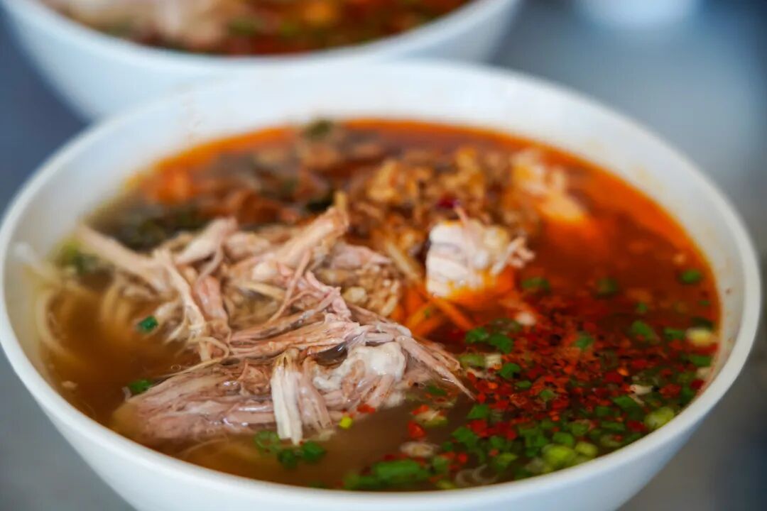 一碗餌絲一碗肉,清湯煮好的餌絲,挑入??肉湯中,香辣爽口、湯汁濃郁。