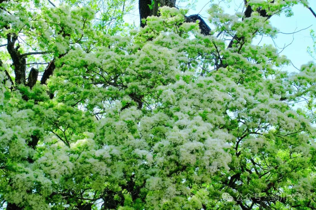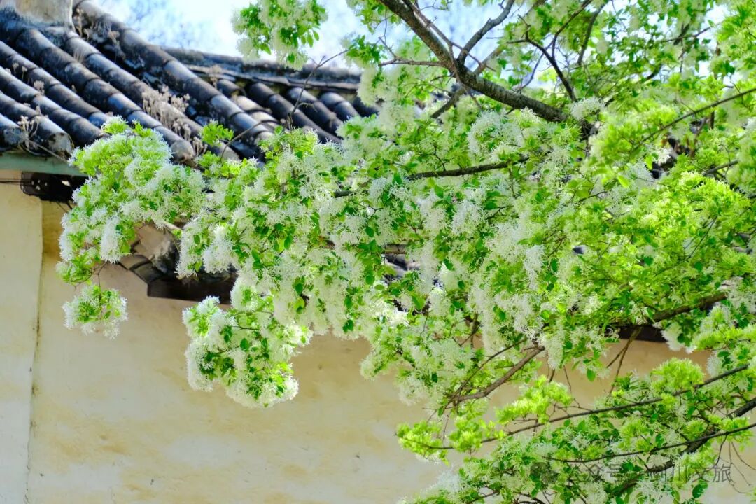 黃龍?zhí)?,無疑是這場流蘇花盛宴的最佳舞臺。四周的流蘇古樹高大而茂盛,樹齡最長的已有480余年,它們見證了歲月的變遷,每年卻依然以最美的姿態(tài)迎接春天。滿樹的流蘇花倒映在澄澈如鏡的潭水中,微風(fēng)拂過,水面泛起層層漣漪,花影搖曳,似真似幻,分不清是花在水中,還是水在花里,好一幅“碧池鏡里樹影搖”的絕美畫卷。