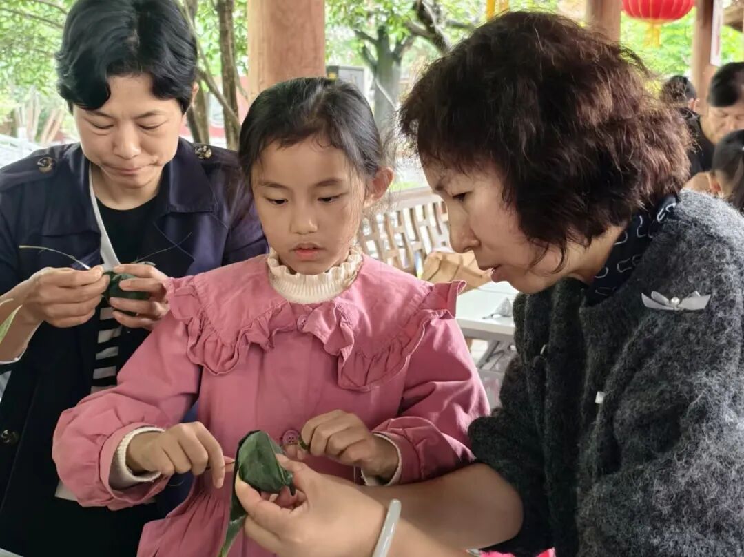 現(xiàn)場備有新鮮粽葉、雪白糯米,工作人員手把手教家長、孩子包粽子。家長帶小朋友學(xué)習(xí),從粽葉折疊到糯米填充、捆綁成型,步驟有趣。形態(tài)各異的粽子誕生,成就感滿滿,包好的粽子還能帶回家與家人分享喜悅。