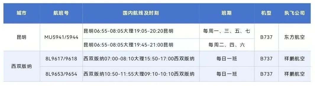 省內(nèi)環(huán)飛航線:昆明、西雙版納