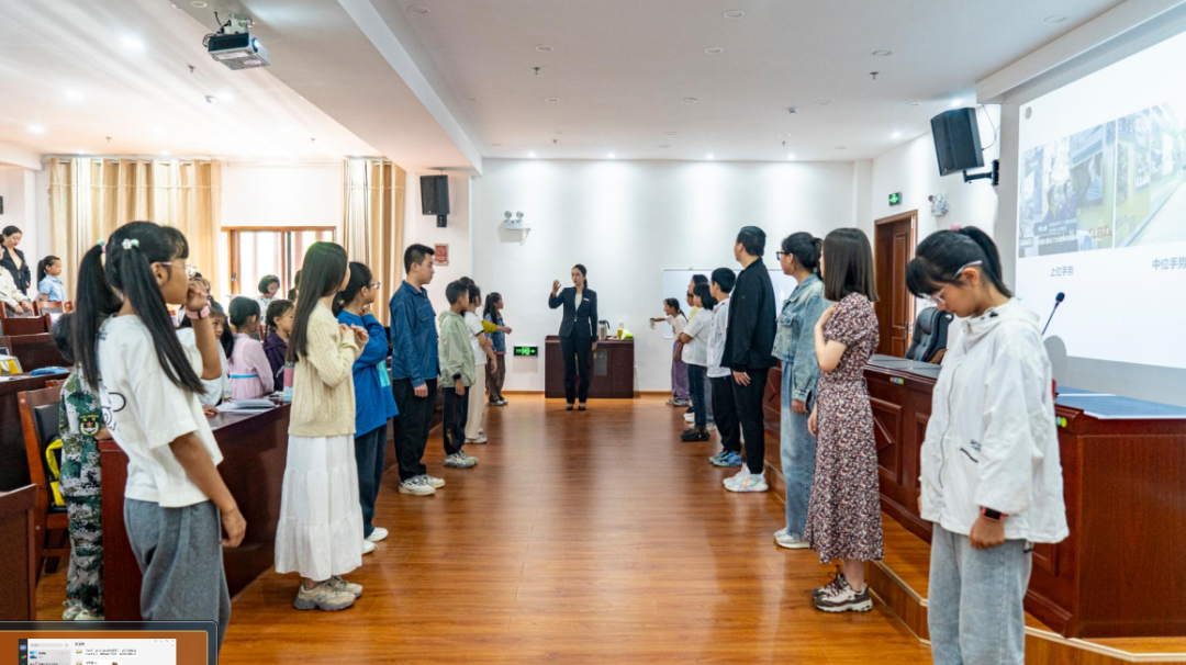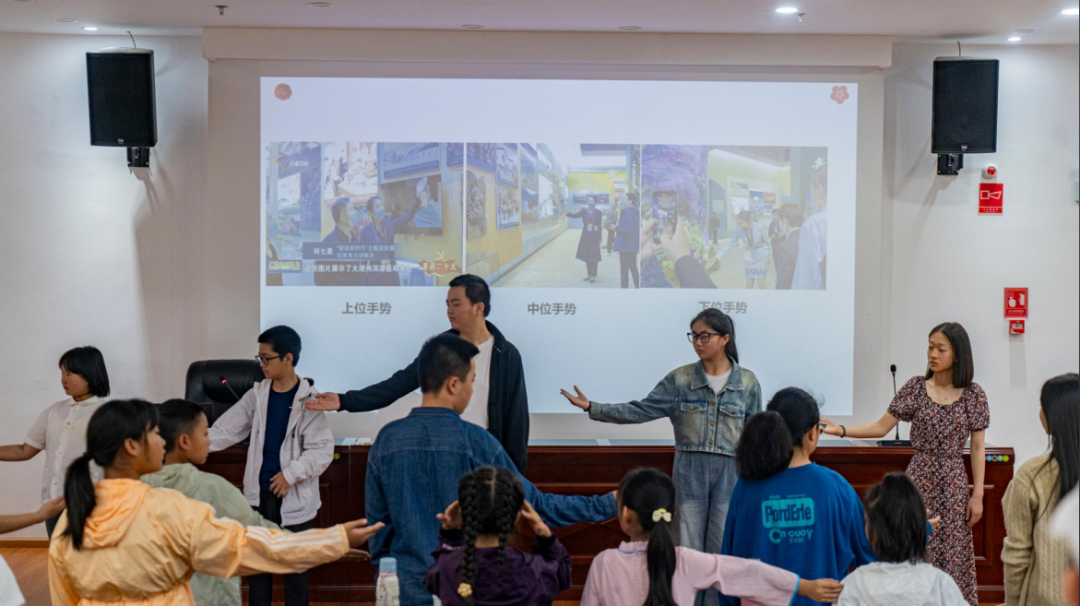 站姿要挺拔如小松,手勢要優(yōu)雅不夸張,眼神交流要溫暖又自信……何老師親身示范,每一個動作都透著專業(yè)范兒。孩子們學(xué)得有模有樣,挺直小腰板,練習(xí)著“大家請往這邊看”的指引手勢,瞬間感覺“講解員氣質(zhì)”蹭蹭上漲!連走路都自帶“文化傳播者”的氣場了呢!