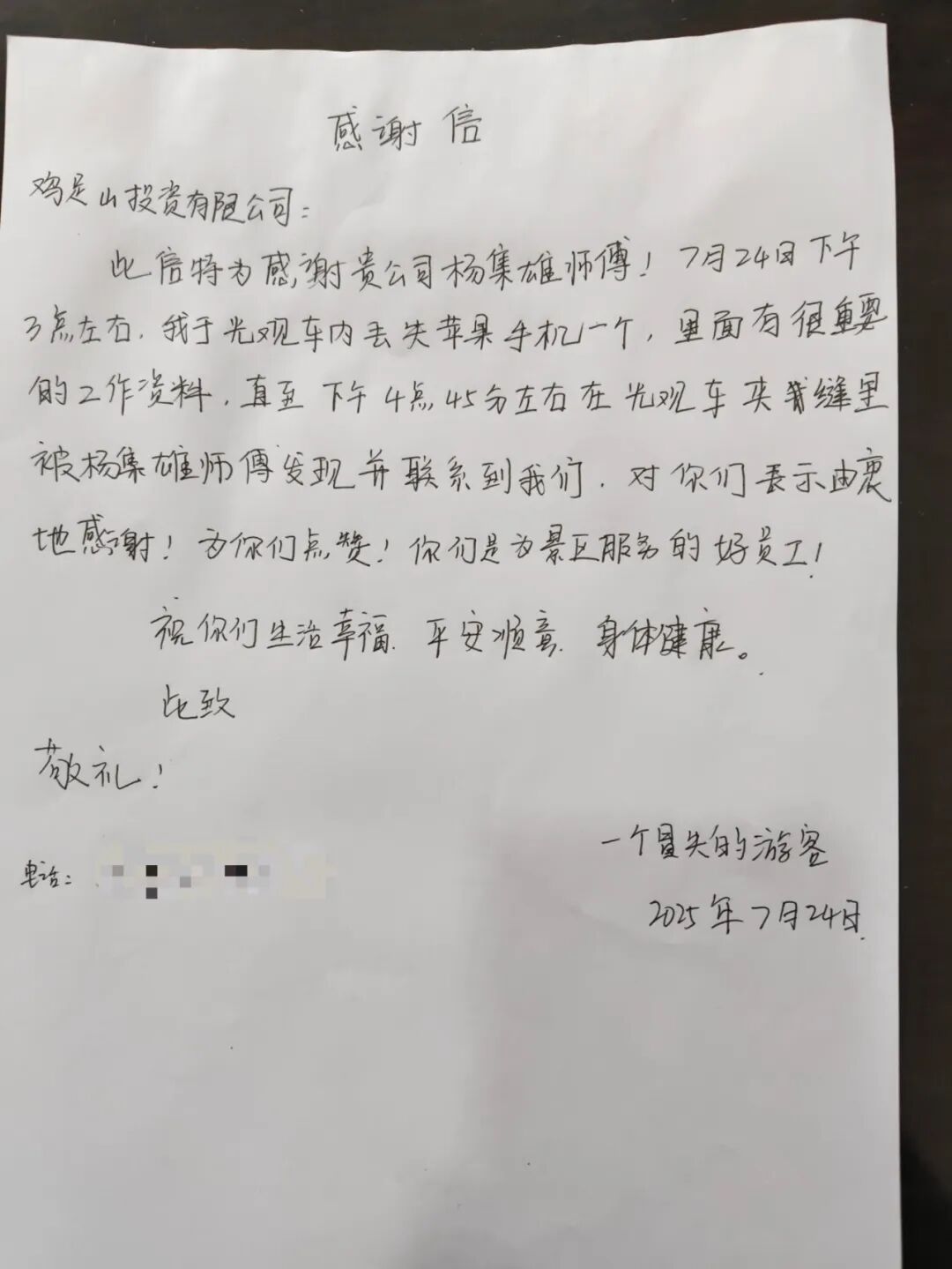 7月24日,游客王先生在雞足山景區(qū)游覽過程中不慎將手機(jī)遺失在觀光車上。在得知游客手機(jī)遺失后,觀光車部門工作群立即發(fā)布了尋找手機(jī)的通知,經(jīng)仔細(xì)排查,最終駕駛員楊集雄在自己駕駛的車輛內(nèi)成功找到手機(jī)并及時(shí)與失主王先生取得了聯(lián)系。溝通過程中,楊師傅態(tài)度謙和、耐心解釋,清晰告知王先生領(lǐng)取地點(diǎn)和流程,有效緩解了游客的焦慮。王先生被楊師傅高度負(fù)責(zé)的態(tài)度和高效的行動(dòng)所打動(dòng),事后親筆寫下情真意切的感謝信,對(duì)楊集雄的善舉高度贊揚(yáng)。