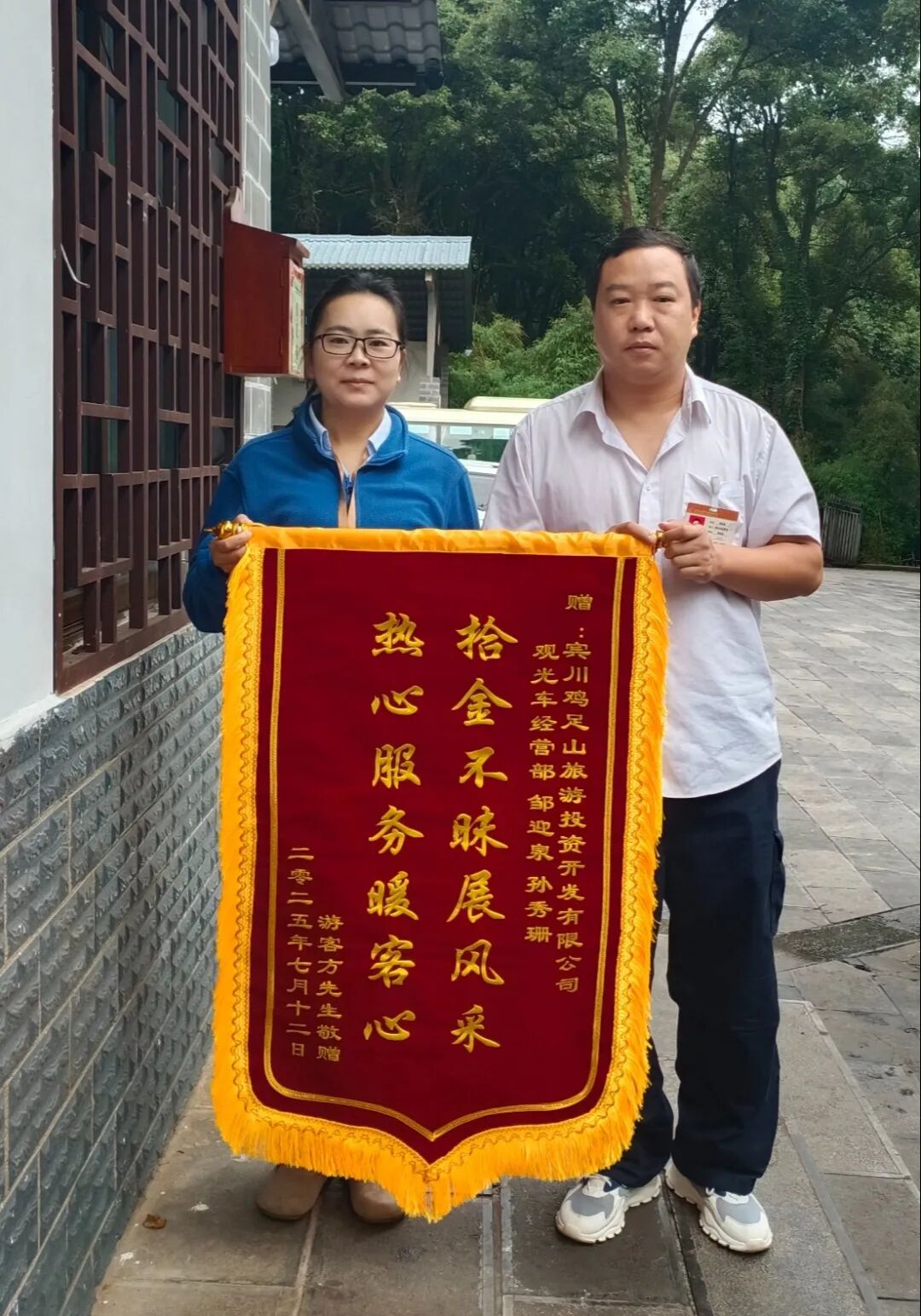 7月12日,游客方先生在游覽過程中不慎將錢包遺落在觀光車上。觀光車駕駛員鄒迎泉發(fā)現(xiàn)后,第一時(shí)間上報(bào)并將錢包轉(zhuǎn)交至部門辦公室。辦公室工作人員孫秀珊迅速響應(yīng),立即在公司釘釘群發(fā)布失物招領(lǐng)信息。次日,方先生通過電話聯(lián)系尋求幫助。孫秀珊耐心細(xì)致地與方先生核實(shí)信息、確認(rèn)物品無誤后,確定了便捷解決方案:錢包內(nèi)現(xiàn)金通過微信轉(zhuǎn)賬即時(shí)歸還;其余貴重物品則安排安全郵寄。方先生深受感動(dòng),事后特意寄來一面印有“拾金不昧展風(fēng)采 熱心服務(wù)暖客心”字樣的錦旗,向其表達(dá)了由衷的謝意。