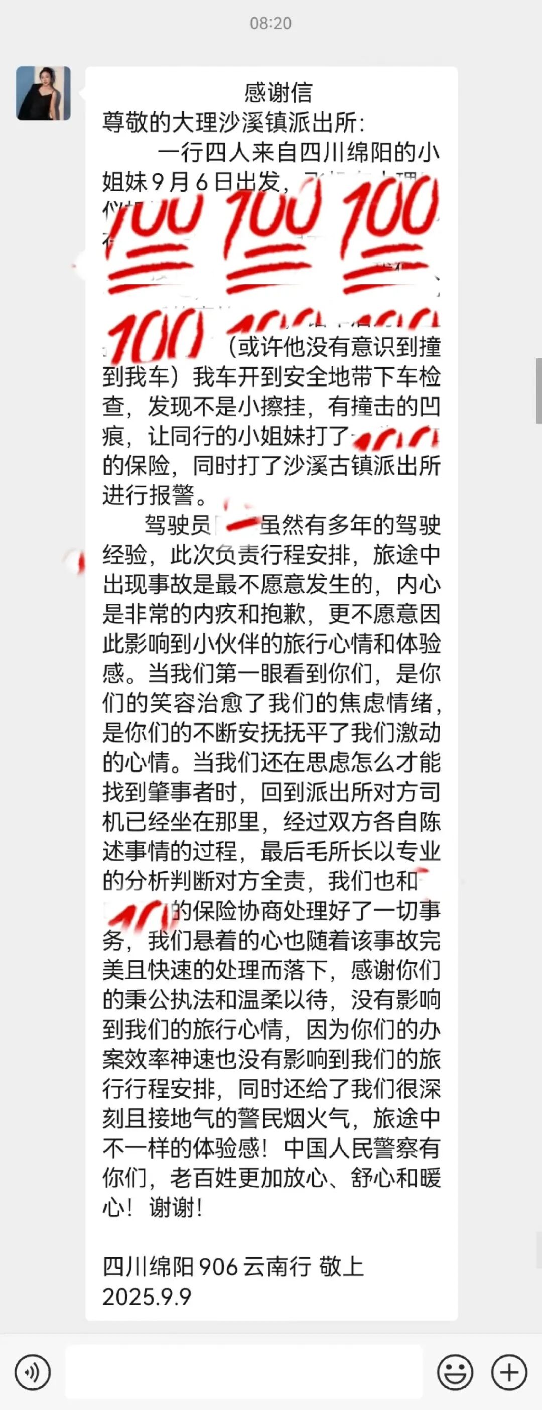 9月9日,游客馮女士一行人將一面寫有“公正執(zhí)法,熱情服務(wù)”的錦旗送至劍川縣公安局沙溪派出所,并通過微信向民警發(fā)送感謝信,對民輔警高效處置交通事故、公正維護(hù)群眾權(quán)益表示誠摯感謝。
