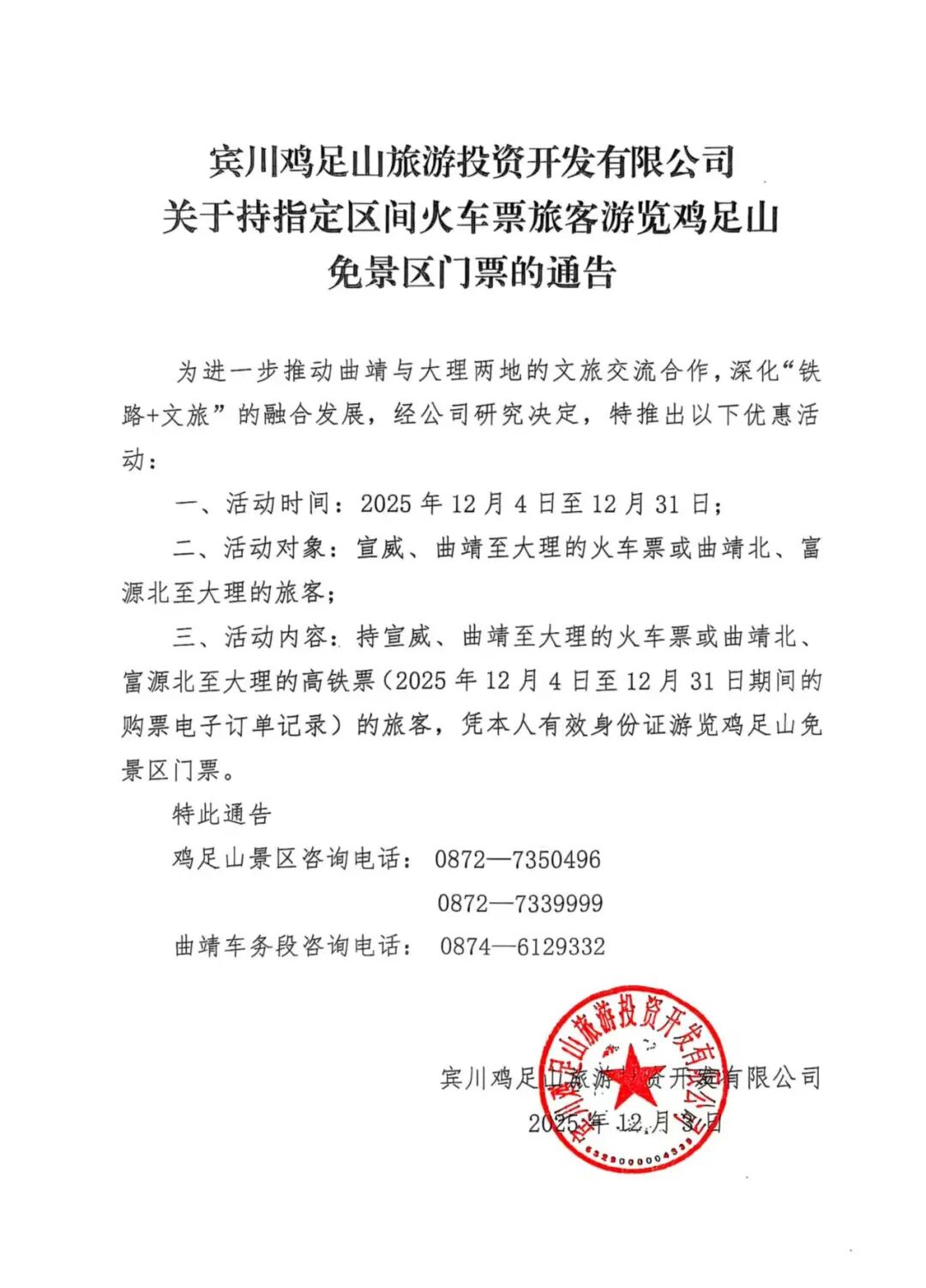 為進(jìn)一步推動(dòng)曲靖與大理兩地的文旅交流合作,深化“鐵路+文旅”的融合發(fā)展,賓川雞足山旅游投資開(kāi)發(fā)有限公司、中國(guó)鐵路昆明局集團(tuán)有限公司曲靖車(chē)務(wù)段攜手推出專(zhuān)項(xiàng)優(yōu)惠,憑指定區(qū)間火車(chē)票,即可免費(fèi)暢游雞足山。